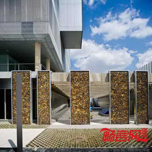 建筑地界线后退,以符合城市规划发展要求。最具个性的一点在于——电镀铝丝网,上有能够控制景深和光线的穿孔。这些网格板在白天时阻隔了通向室内的视线,而从建筑内部往外的视线则畅通无阻。晚间,建筑灯火通明,将内部设施展现给外界。建筑四周设立了一些天然石材围栏;同材质的石材内部凿空,使用黑色大理石和木材穿过。
