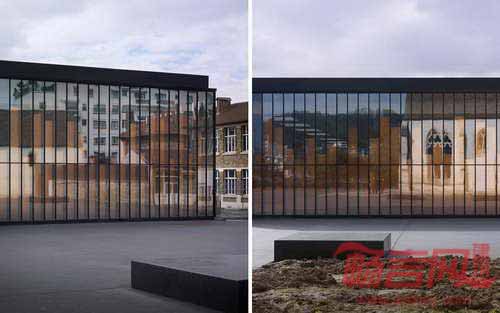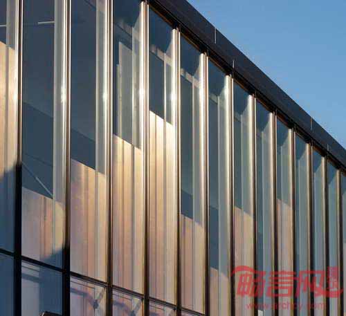 玻璃立面反射了临近建筑,形成万花筒般的效果。双层系统的首层玻璃映照了室外环境,并将日照引入,第二层是铜金属表皮,使反射的景观改变了色彩。白天,建筑产生缩进效果,夜间则被室内进行的活动灯光照亮。