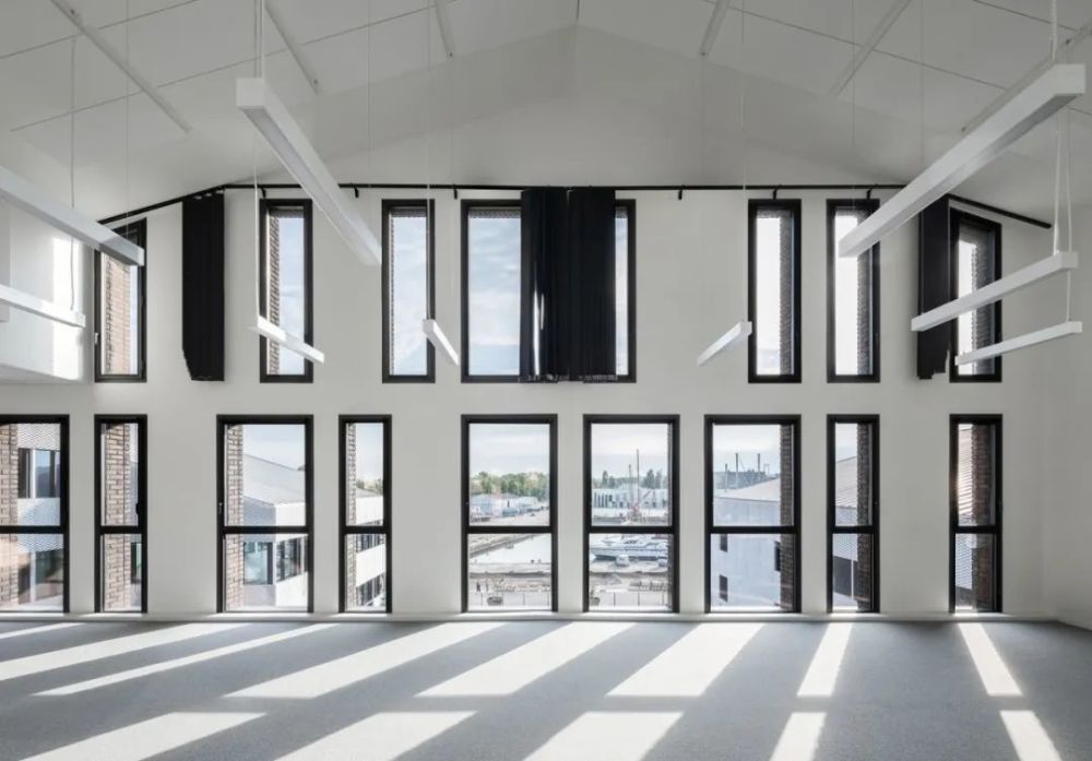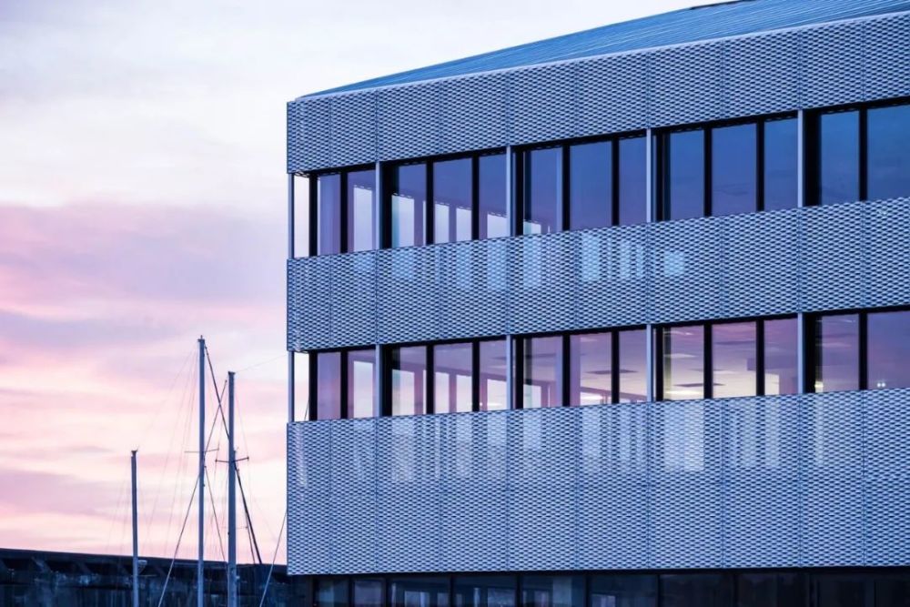 码头边的建筑物高度逐渐降低,立面覆盖着阳极氧化铝网,突出了体量并捕捉光线,产生了微妙的色调变化。