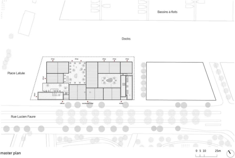 住宅酒店围绕一个中央天井,除此之外办公用户还可以使用两个木材覆盖的大型共享种植露台。第一部分位于一楼,俯瞰码头区,将新鲜空气引入中心区域,并打开码头区的视野。第二部分位于塔楼的七层,与 Place Latule 毗邻,展现码头和城市全新的景象。
