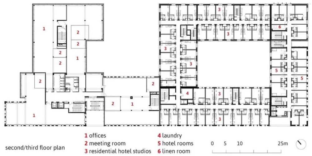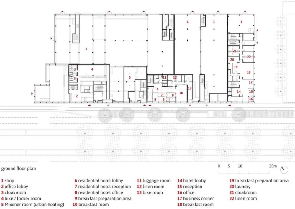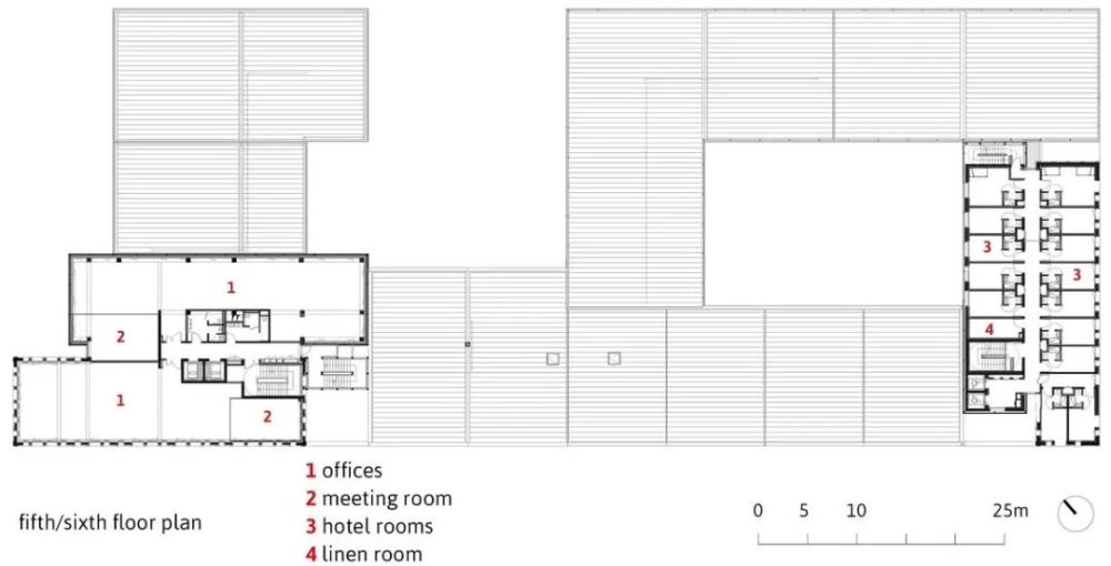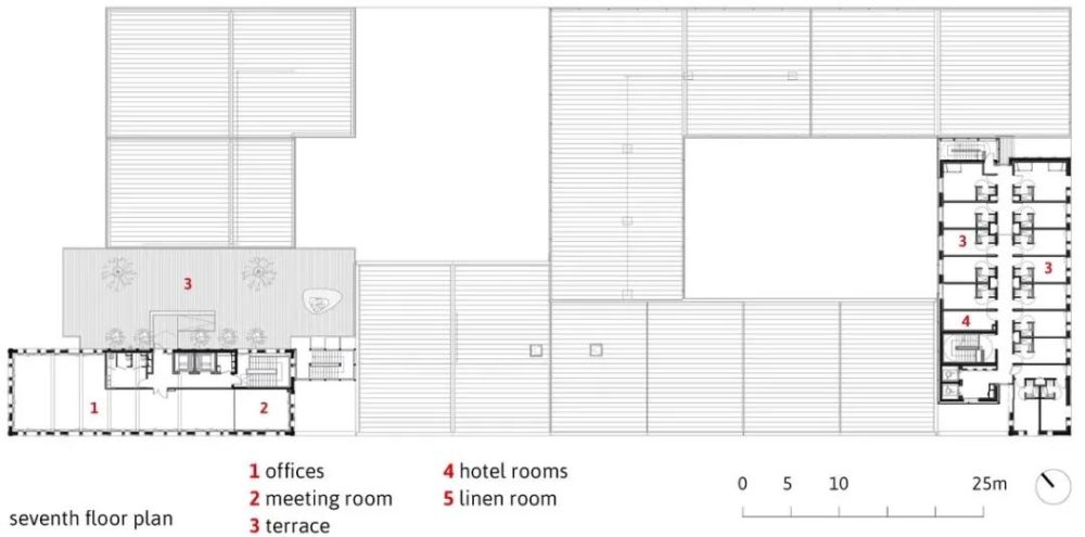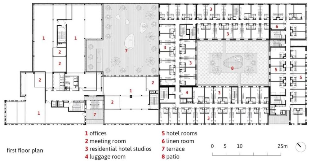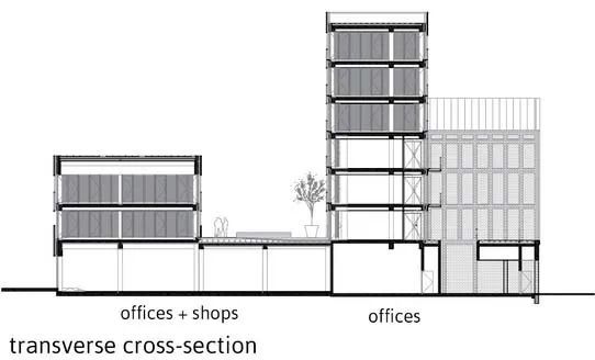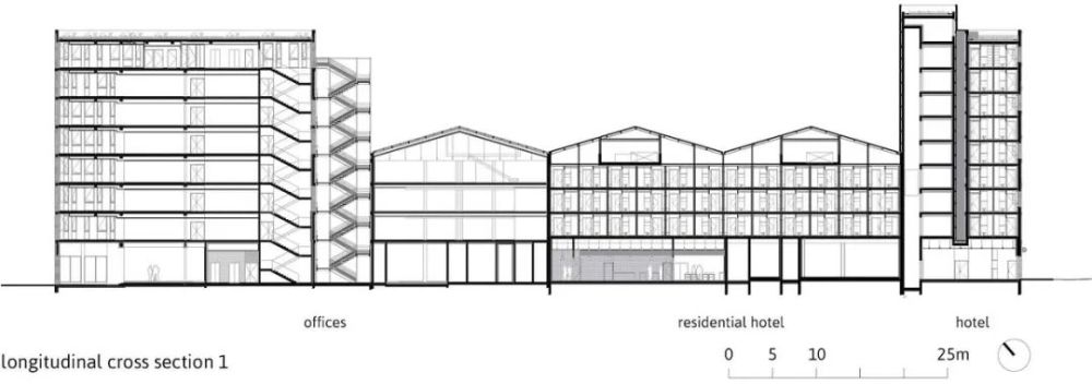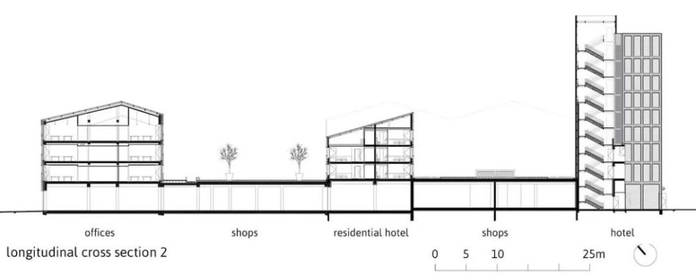 项目总建筑面积15119㎡,结合了四个不同的实体:办公室(5755㎡),一个拥有124间客房(3061㎡)的三星酒店,一个拥有128个工作室(3392㎡)的长住酒店,以及底层商铺(2911㎡)。它的形状布局不仅考虑了建筑的连贯性,也确保了不同项目实体的独立性,以此避免不同适用人群相互间的干扰。