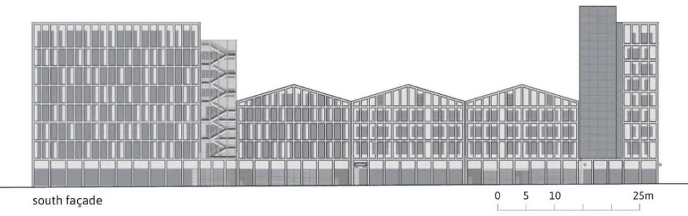 设计向当地的工业和海事历史致敬,以当代风格重新诠释它。该建筑以体量为中心,巧妙地结合了码头区的工业棚和 rue Lucien Faure 沿岸的码头的形式和材料。两个像塔楼一样的更高的建筑将其从地块的中间断开,高耸之处成为了基地内的地标,并给码头和这座城市提供了之前不曾有过的景色。