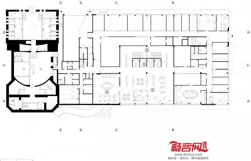 项目原址是一个建于20世纪80年代的图书馆,临近一所19世纪古老的剧场,图书馆的混凝土模度体系模仿了剧场的外立面特征。图书馆老化速度很快,到21世纪时明显已经落后于时代。因此,相关方面组织了一场设计竞赛,要求将剧场也包含进去。Nyrens建筑事务所最终在竞赛中胜出,他们的设计方案保留了混凝土立面,作为80年代的时代标记,并在此基础上添加了第三层表面,呈现出当代的建筑语言,将所有组件全部容纳到一个动态整体中,从而使建筑内部展现出系统的多样性。