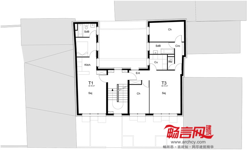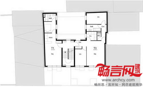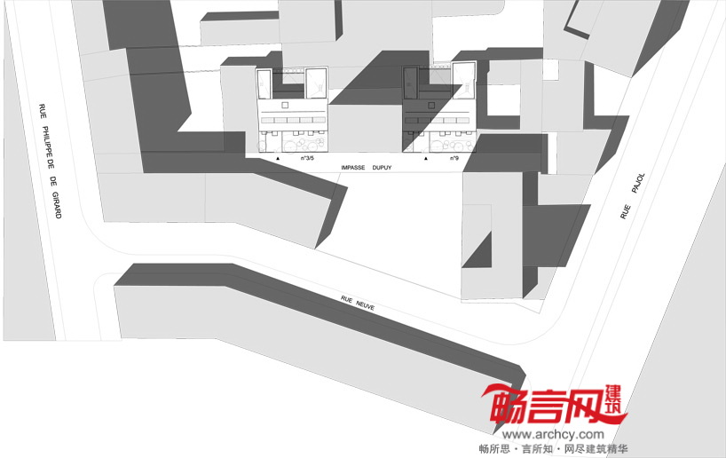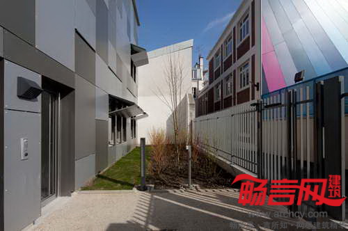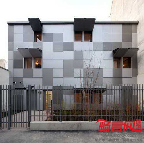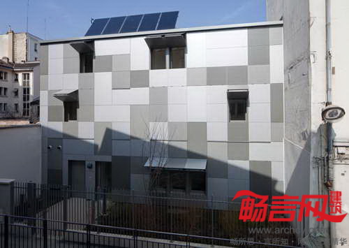 法国RMDM建筑事务所最近完成了一项“十套高性能公寓”的设计,公寓属于社会福利房,位于巴黎十八区,周围正在进行城市改造工程。公寓给低收入群体提供了住所,户外有休闲区域,为公寓和拥挤的周围建筑之间创造了绿色缓冲区。入口立面外墙有垂直的铝丝网,三种色调从白到灰,活跃了外立面,使建筑从被隔绝的周围环境中跳脱出来,还能有效调节住户的日常生活。铰链结构使得窗户能从多个角度开合,满足住户隐秘需求,并遮挡日晒。生活空间设在公共空间上方,而屋顶则安装了太阳能板,颜色与建筑外立面相协调,能为公寓供应热水。
