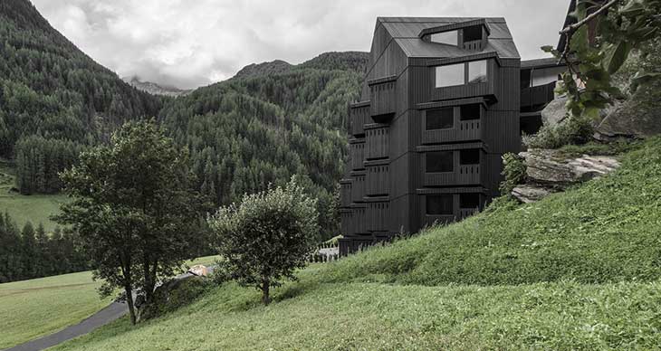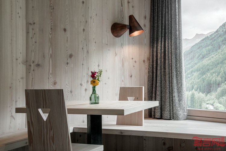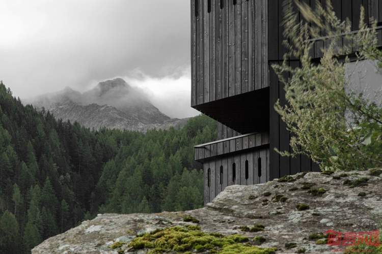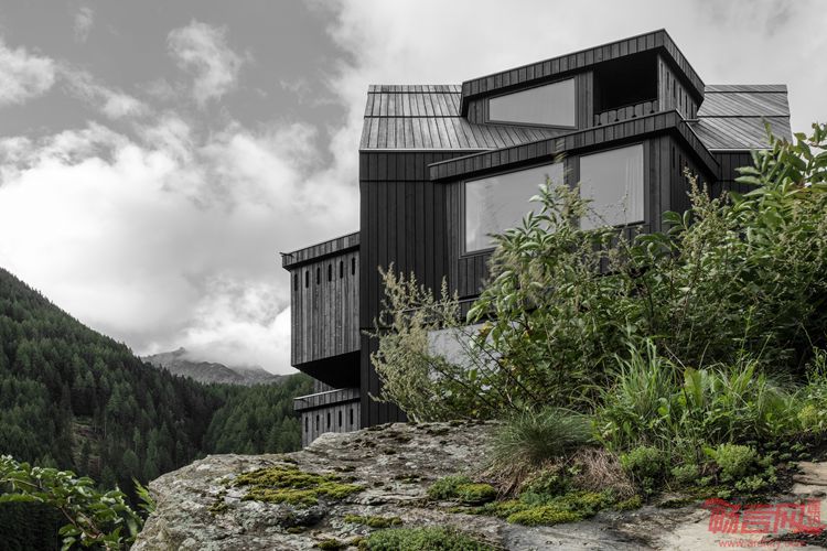 已有酒店大楼坐落在意大利Buhel海拔1200米的高地上,新建建筑位于其东侧较低的位置。这一徒步者酒店扩建位于地块的北面,因此原有建筑不会在使用或光照上对新建筑产生影响。不对称的鞍状屋顶同周边的山丘形态吻合,同时满足空间布置上的灵活性。这一六层项目包含20个客房,水疗Spa和餐厅。外立面是黑色釉面松木板,营造了同阿尔卑斯山环境的互动。不过,当地材料赋予建筑温暖的光泽。地面采用附近森林的树木制成,室内装饰还用到当地铜矿出产的原料。