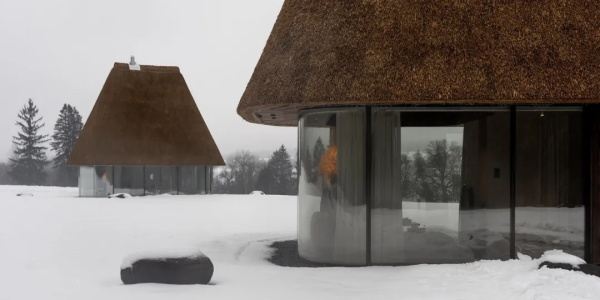 在乌克兰中部的一处私人庄园里,YOD设计的“芦苇屋顶下的客房”以一种内敛而又大胆的建筑手法,重新诠释了乌克兰传统茅草屋的形象。这些50平方米的客房摒弃了传统茅草屋不透明的粉刷墙面,取而代之的是落地玻璃窗,将茅草屋顶放大成一个醒目的雕塑形象。