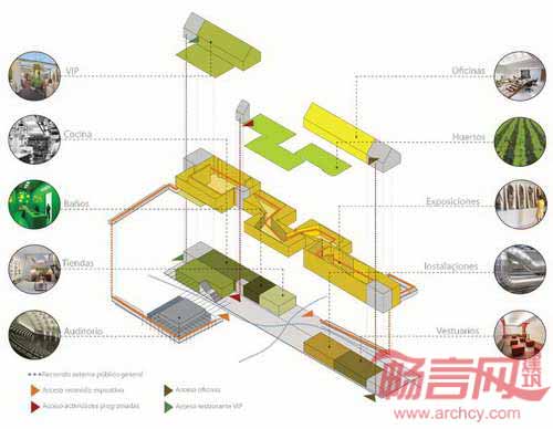 依照设计目的,建筑成为了一个玻璃围合设施,容纳了若干小花园以及围绕美食烹调和食物制造的展览。