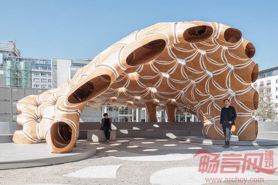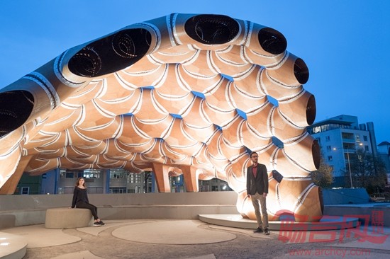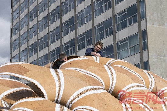 德国斯图加特大学的运算化设计学院(ICD)和建筑结构与结构设计学院(ITKE)合作完成了一座新亭子的设计和制作,展现了壳状木片的自动化纺织加工工艺。