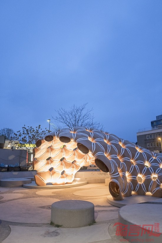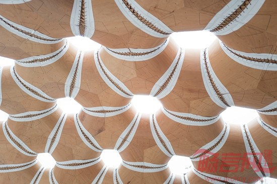 这座亭子标志着首次在建筑领域使用工业化缝制的木质材料,体现了计算机运算化设计、仿真和加工工艺在建筑领域的巨大潜力。该项目由一群跨学科的学生和研究人员完成,其中包括建筑师、工程师、生物学家和古生物学家。