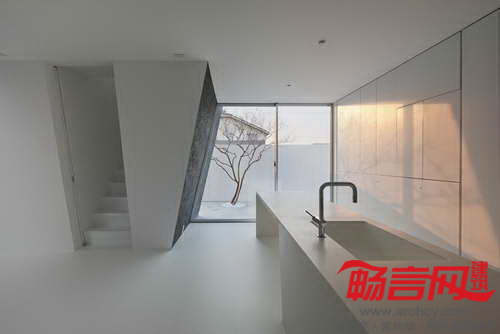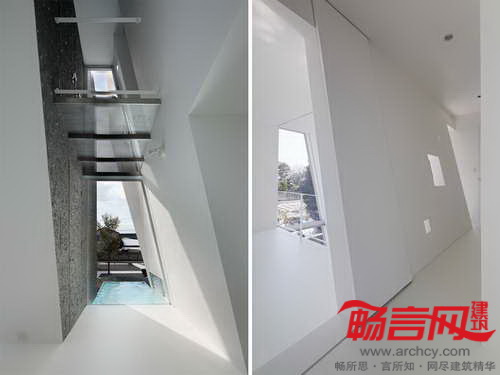 住宅的生活区设在分离建筑体搭建的斜面空间里。通过大扇的玻璃窗,住户可以从通透、明亮的室内环境中清晰感受到同自然环境的联系。