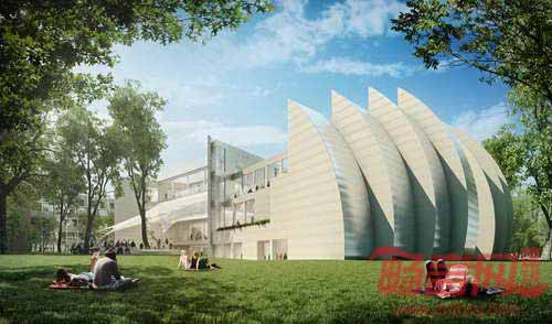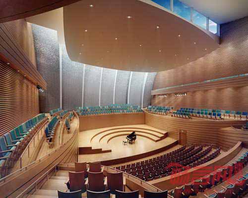 演奏厅可容纳500人,运用了更为鲜明的垂直元素以及弧线实心形状,达到控制进入表演区和多功能礼堂光线强度的目的。建筑外部区域包括一块绿化区,以及连接走道的室外剧场。