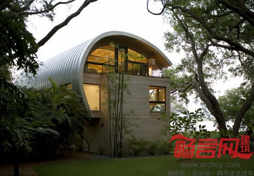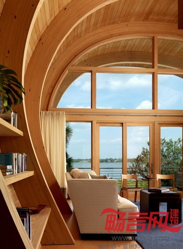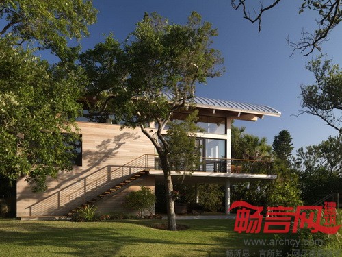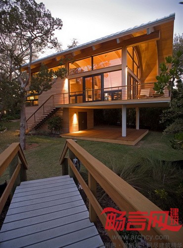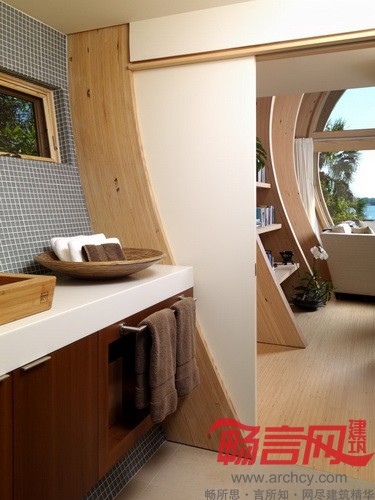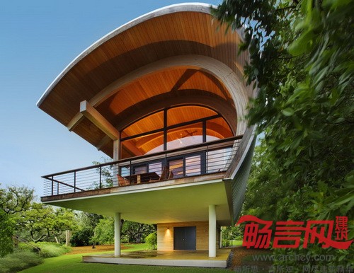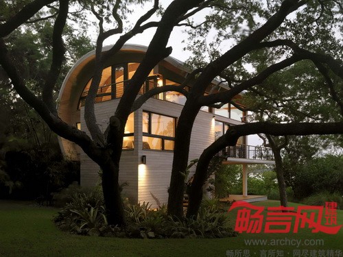 岛上橡树林的东边有一座造型奇特的房子,房子的另一面就是红树林。这座房子的屋顶和背部都是弧面形状,整体采用的是木质材料,设计师如此选材主要是受两方面的启发。