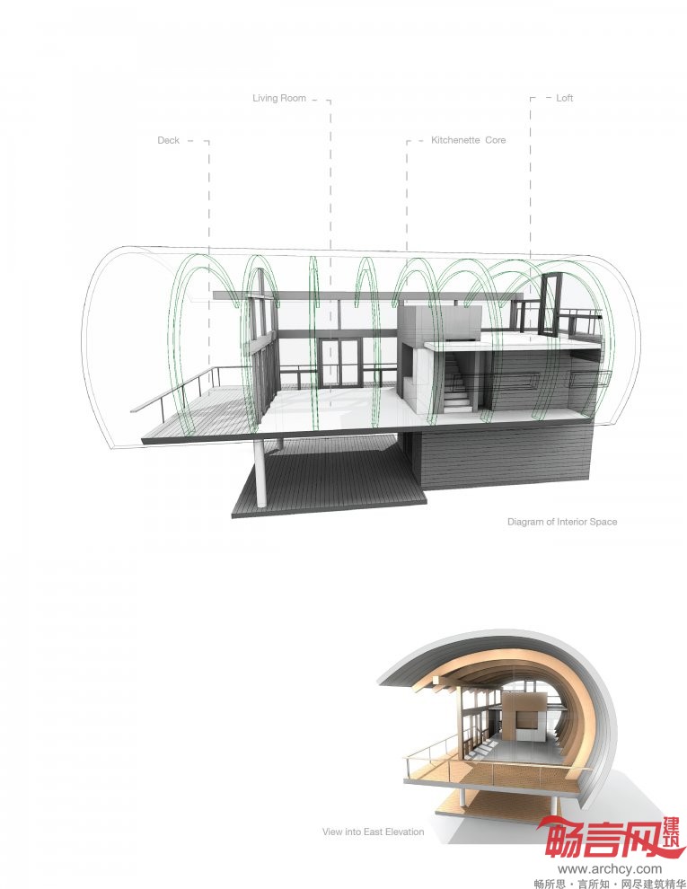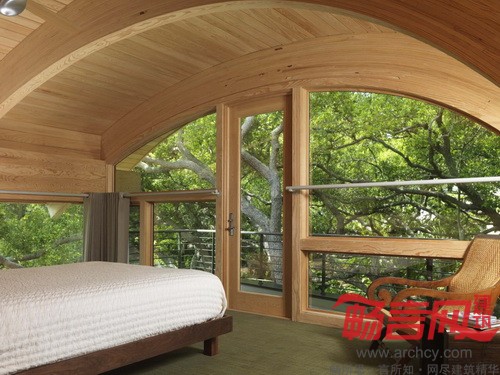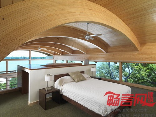 另一方面的启发则来自于这片橡树林——当海风吹来时,橡树的躯干和枝叶被吹成弧形——这就是弧顶屋顶的灵感来源。为了生动反映出橡树被吹弯时的弧形状态,设计师选用了多层胶合木板作为框架梁,这样更便于弯折,然后再用层压松树板进行覆盖。这种弧面结构从房子底部的水泥板一直延伸到房顶的前沿,这样就淡化了房顶与墙面之间的界线。