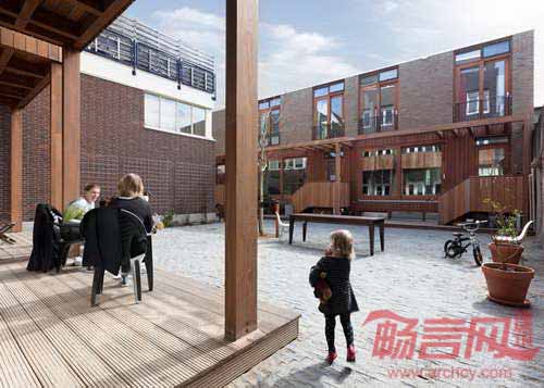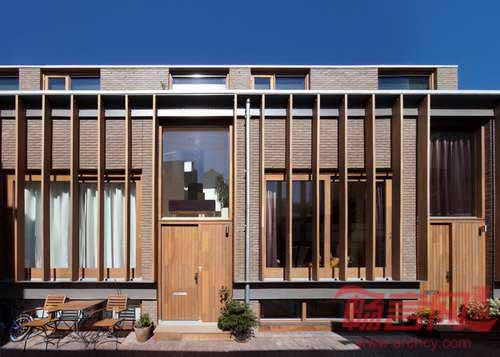 项目同时建造了三栋朝南的三层住宅,每栋房屋均具有大地色砖墙和木窗。狭窄的巷道从Eland街通向场地中央L型庭院,六户房屋住户共同分享这一院落。住宅楼具有法式落地窗,朝向木质露台,从阳台两侧可以俯瞰中央庭院。