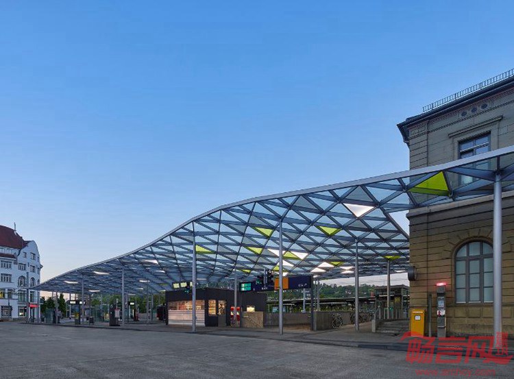 项目位于德国Esslingen,面积2000平米,于2014年建成。项目由Werner Sobek设计,是一个竞赛优胜方案。Esslingen中央车站通过一个新建天棚得到提升。设计师创造了弧形顶棚,造型来自周边的自然环境。通过长边的鼓翘,遮蔽空间朝向周围的葡萄园和小山敞开。屋面结构由单根钢柱支撑。结构由弧面钢架组成,基本原件是三角造型。