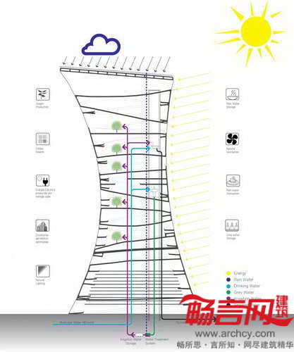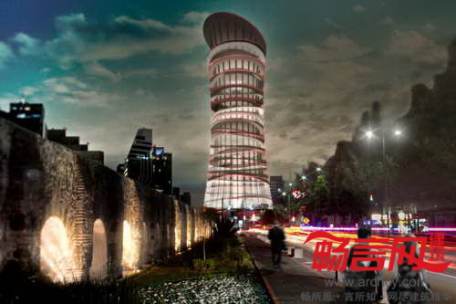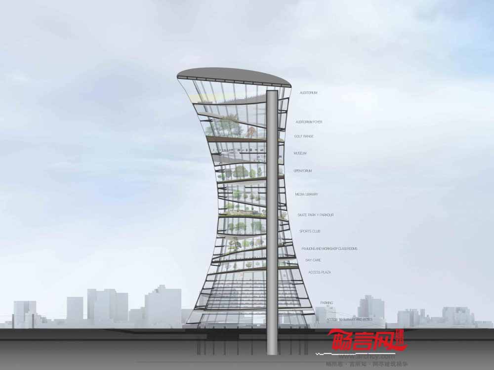 建筑包括26层,总高度达到330米,1到12层将设为公共停车场,为公共设施维护提供部分资金;建筑本身将成为社会融合的象征。