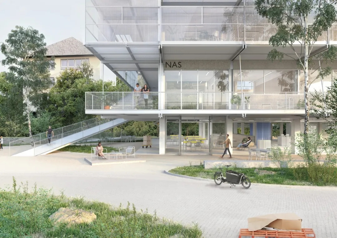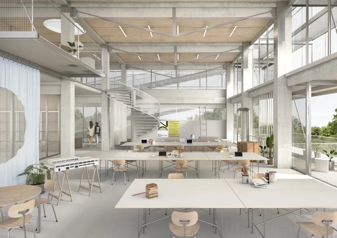 该项目涉及改造和扩建一座1970年代的模块化混凝土印刷厂,采用与 Schlaich Bergermann 合伙人合作开发的轻量化策略。该策略将 mass timber 内部与模块化钢木混合结构相结合,并在顶层设有悬挂的木屋顶。根据“轻触”策略,气候概念强调低技术解决方案。实际上,它通过一些没有暖气的空间,既可以为学生提供额外的区域,又可以作为气候缓冲区。