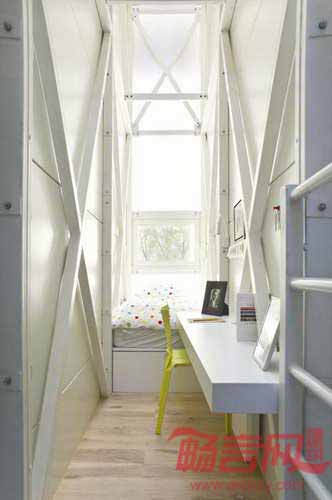 房屋主体被架高,并由下侧楼梯通往室内区域。建筑最窄处仅有72厘米,由此很容易理解:家具均来自定制,同时是费力地推进房内的。