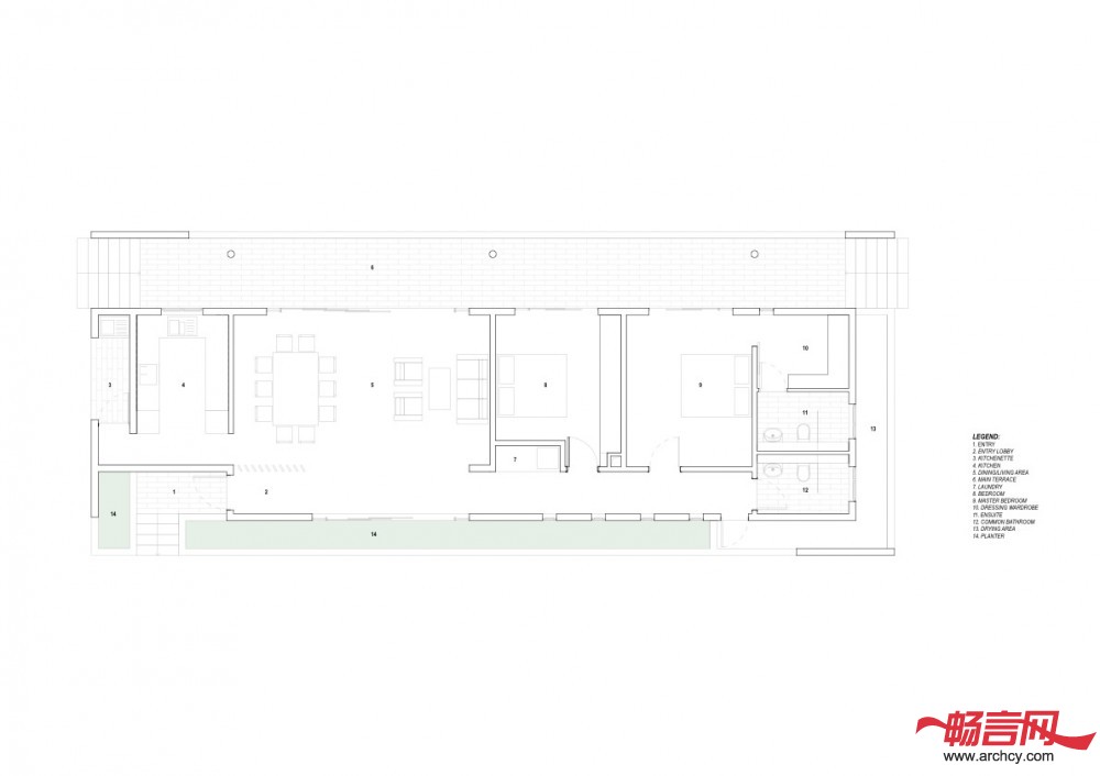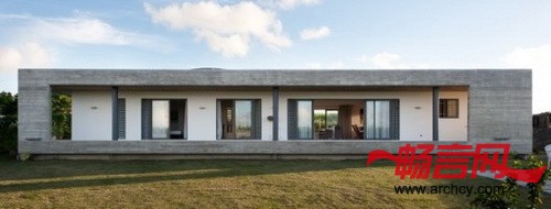 CG住宅位于一个农业地块上,占地1,000平米,在它不远处就有一片松树林。地块是长方形的,在一个南北走向的缓坡上面(两端高度差为1.5米),地上有岩石露出,但是周围没有树木。我们的设计就是建造一个两个卧室的住宅,这个住宅的所有房间都在同一层,而且保证能有最大面积的绿地,因为客户喜欢园艺,而且他喜欢在花园里招待客人和进行家庭聚会。客户是一个室内装饰师,她希望我们的住宅能够反映出她的设计偏好,并能让她在住宅里展示她最近的室内装潢设计。因为预算有限,所以我们需要建造一个功能全、维修费用低,又能保证住宅非常显眼、并和周围环境融合、同时又要从某种程度上体现农业色彩的住宅。我们使用了木板百叶窗和混凝土外壳,这样既与附近的松林相互协调,又保证了外墙需要很少的维修。