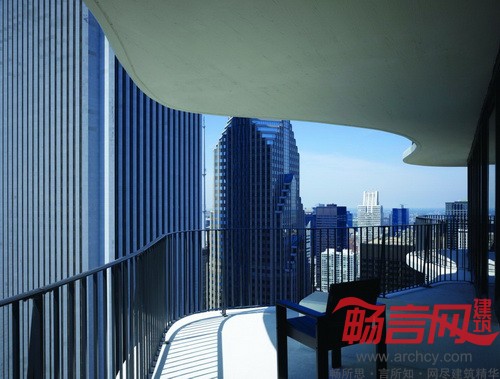 各楼层曲折的阳台形成一系列的等高线,构成了大楼的表面轮廓。阳台大约探出楼体约12码的距离。各楼层的阳台形状也不尽相同,主要依据各楼层视野、光线条件和不同区域的户型结构来设计。整体来看,这些阳台使得楼体呈现出波浪形的轮廓,既展现了别具一格的造型,同时也是体现了很好的实用性。