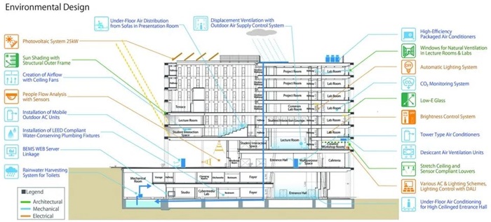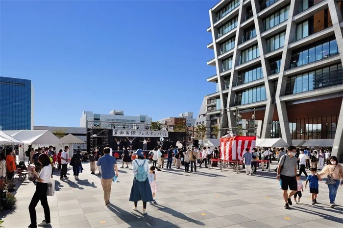 从规划阶段开始,大学就积极与市政府和企业合作,探索广场和连廊等公共空间的理想状态,引领了箕面船场地区的新型城市建设。作为学生和市民的活动场所,动感的建筑形态和与架空层连为一体的广场散发出勃勃生机,广受好评。