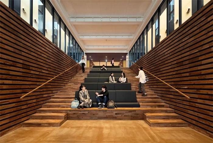 作为集学、聚、住为一体的新型街区城市型校区,大学须面向社会开放并与之共存,以产生相得益彰的协同效应。作为该理念的具体呈现,规划通过消除场地的物理边界,将大量的开放空间与公共空间融为一体,成为城市的公共空间。3楼步行连廊层的画廊咖啡厅和食堂向公众开放,以促进地域的日常交流。