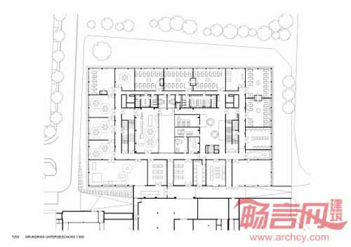 大厅面向内部庭院,后者包括新楼和已有WIFI主楼之间的大型广场。这一广场成为核心聚集空间,便于人们进行各种交流沟通。