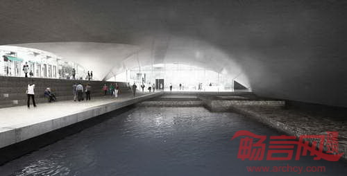 电影院如同庇护所和存放集体记忆的场所,造就了城市历史、湖泊和公共空间之间的对话。尽管地中海遗迹挖掘工程要求拆除一所学校,白色混凝土影院将覆盖考古遗迹上方,以一道和缓拱形结构与地面相接。