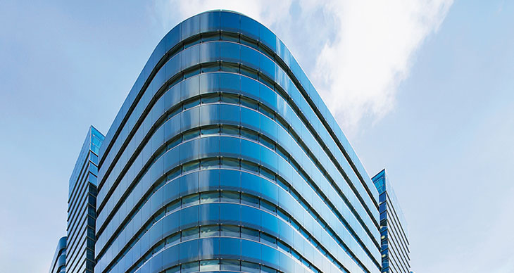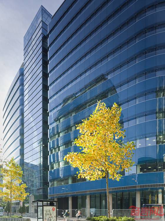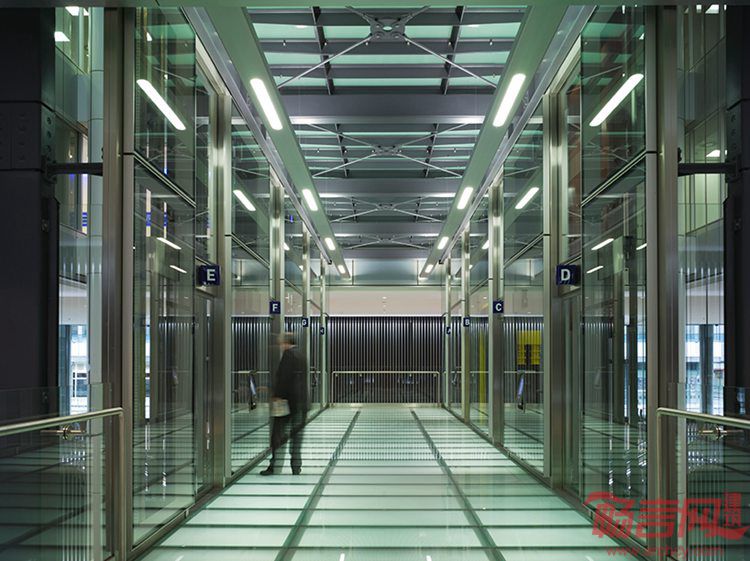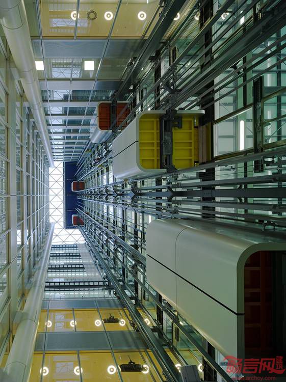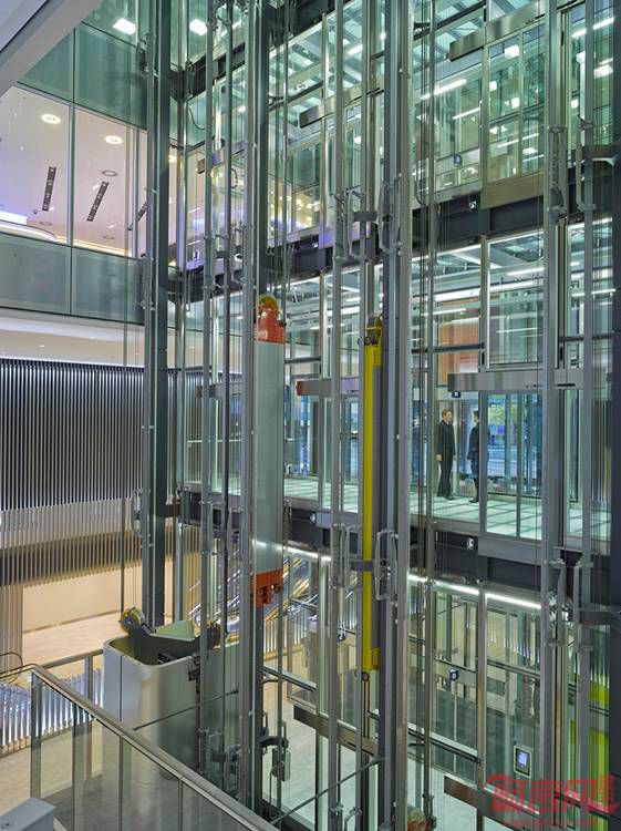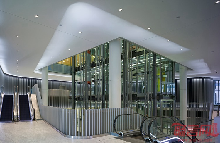 Grimshaw设计的St Botolph大楼位于伦敦市中心,是一座标志性办公楼。这座建筑覆盖了弧度蓝色玻璃,建筑面积达到53000平米,围绕光照充足、包含主要流通方式的中庭展开布局。为了满足不同租客的需求,顶部的11层空间涵盖高规格办公室,下房两层空间具有最大使用灵活性和未来潜能。低楼层的多功能空间和零售区域保证了临街单元的活跃程度。中庭包含四个方向的核心,保证所有租客统一的可达性。布局设计让所有16部电梯在同一个电梯井中独立运行,提升了用户的可用性。Thyssen Krupp电梯系统可允许两个轿厢同时运行。智能呼叫系统提供电梯组的协调,并将乘客分配给最适合其目的楼层的电梯。