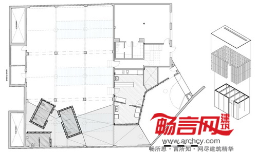 甲方只提出了基本的项目要求,空间内只有三个公共卫生间;正中央设置了三个木头箱。