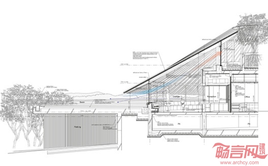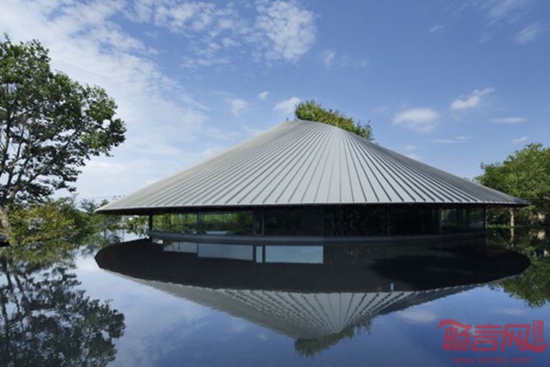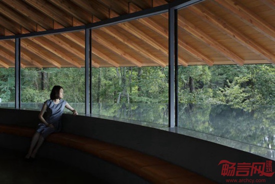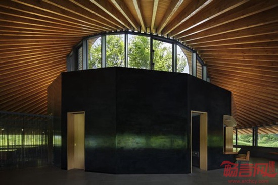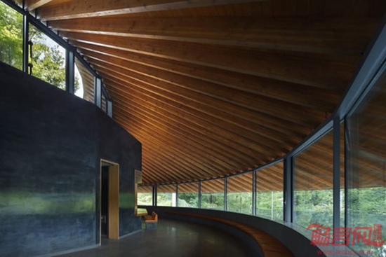 Hiroshi Nakamura and Nap事务所设计的日本狭山公墓礼堂位于一片茂密丛林中的坡地上,俯瞰整座城市。场地拥有超凡的视野,但设计师放弃了开放式布局,而是将建筑封闭在自然环境之外。设计师希望建筑在开放时依然保持一定程度的封闭。为了达到这个目的,将服务相关房间构成中央混凝土核心,让访客休息区和餐厅围绕核心排布。