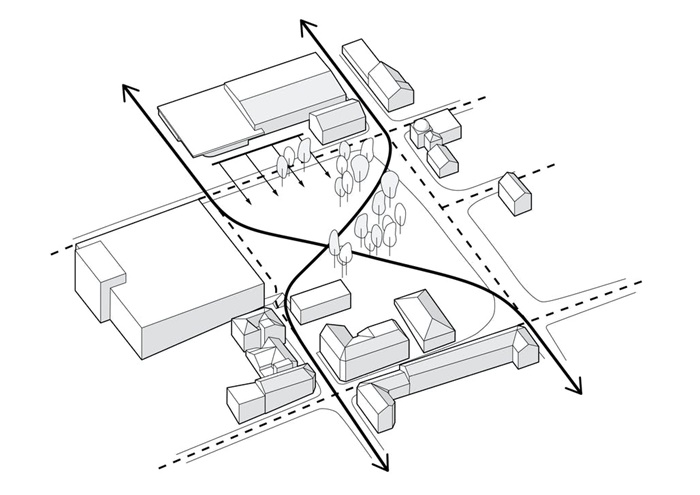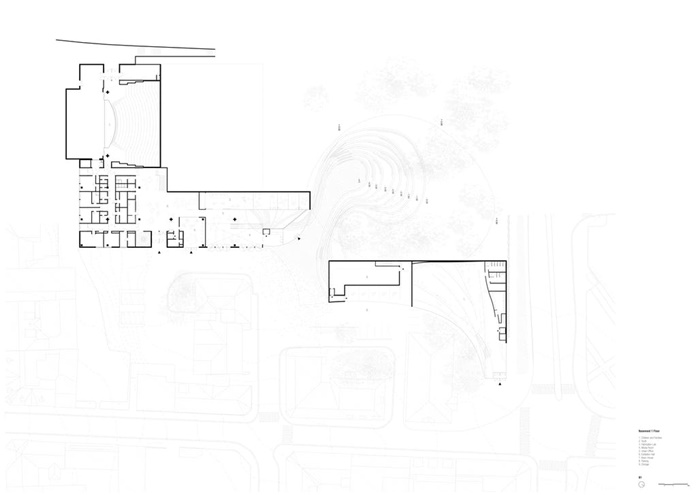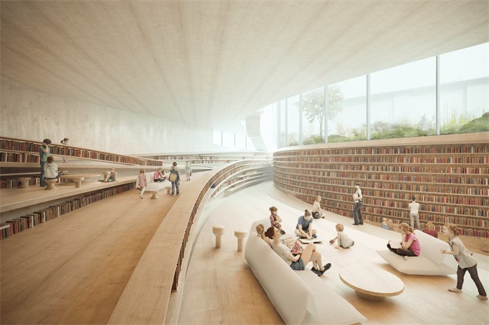 图书馆方案在设计竞赛中成功中标,为Skien引入了新的文化中心,强大的项目可吸引周围社区参与公众活动。图书馆占地面积覆盖了场地边界,使地面和地下两层面积宽敞。两楼层都有开放式平面布局,不设固定墙壁和书架,使用软分隔。