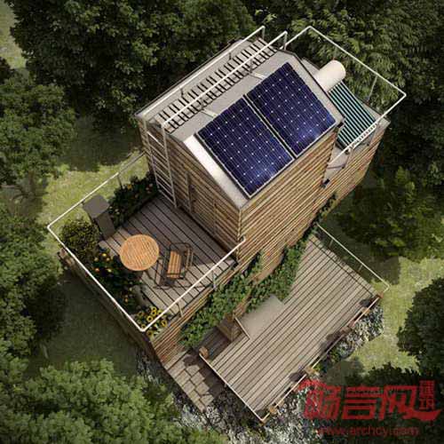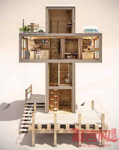 格鲁吉亚建筑师Dachi Papuashvili利用集装箱材料,为一位神职人员建造了紧凑型的十字形微型住宅。建筑师工作地点位于首都第比利斯,希望使项目容纳牧师住所以及普通人员的学习场所。设计意图是利用废弃原料,创造出建筑原型,具有建造简便和自给型特点。建筑师表示,“格鲁吉亚修道院建筑通常采用石材和混凝土建造。我的任务是创造业主居所,利用废弃原料,并减少人工费用。”项目采用两个集装箱,分别为水平和垂直设置,十字形结构住宅有四层。建筑师认为这种造型更多出于功能需求,而非宗教考虑。