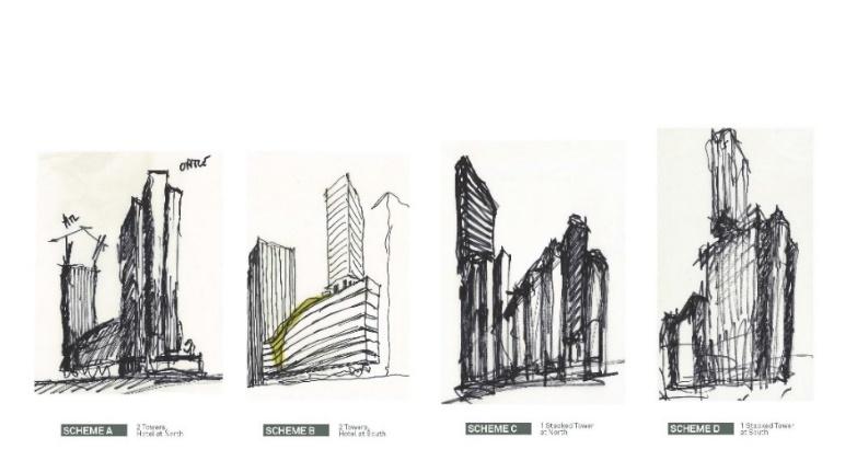酒店和办公业态将建筑划分为多个独立体块,彼此上下堆叠,如同“平衡石( rock balancing)”这一艺术形式。裙楼从平衡石艺术中汲取灵感,并贯穿整座建筑设计。通过每个体块前部的略微倾斜,加强 “石头”的意向特色。堆叠设计通过体块退进,在主塔楼和裙楼之间形成内陷的凹痕,以突出体量主体中办公和酒店空间的垂直感。主塔楼的设计亮点对整体设计效果至关重要,同时呼应“平衡石艺术”的设计隐喻。