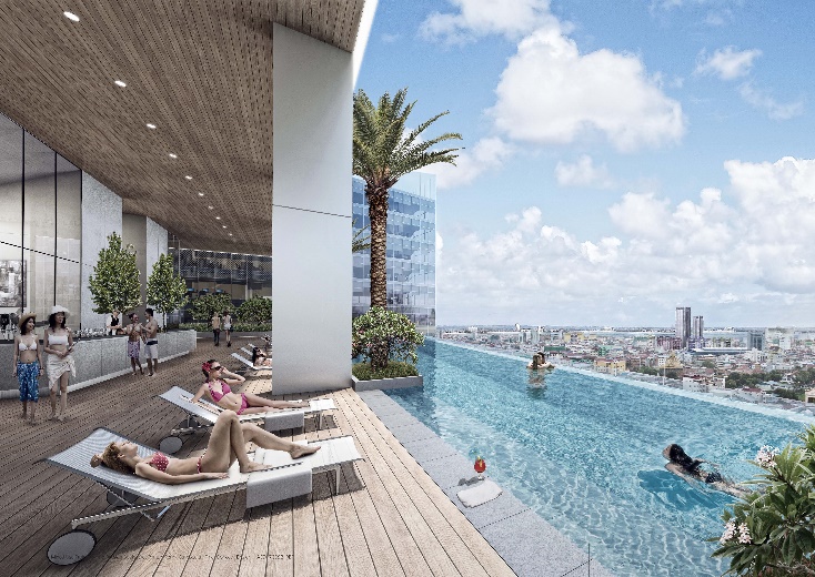酒店位于塔楼顶部,办公位于其下方,商业零售位于裙楼底层。其中,酒店顶层设有屋顶酒吧,可俯瞰金边天际线景观。