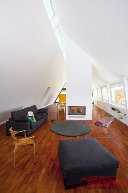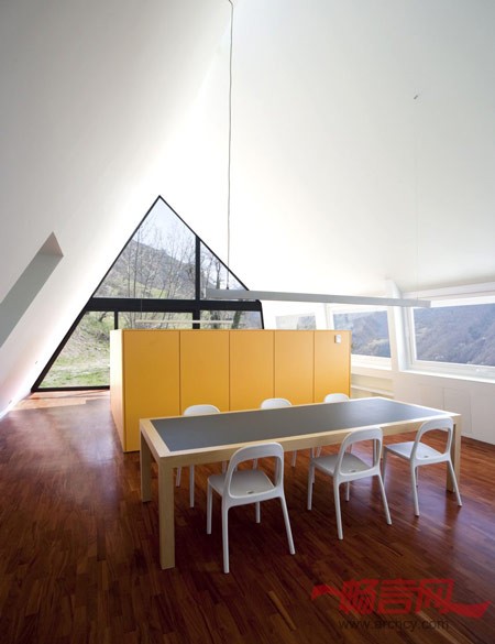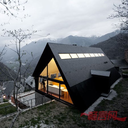 该建筑坐落在山腰上的一座旧农场,其中一面窗户可以俯瞰山谷的魅力风景,而山形墙上的一排高窗可使居住者仰望山脉。