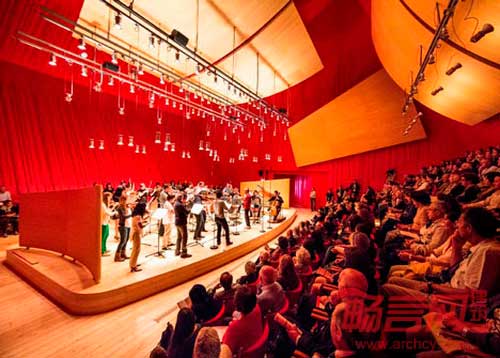 音乐厅位于三个立方体中最大的一个内部,建筑向前倾斜,从而构成了阶梯形的座位区。室内天花板和墙壁上安装了隔音板,有助于声音的回响。
