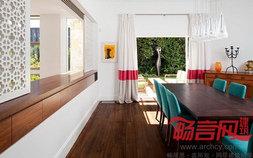 设计师首先要做的就是尽量增加室内采光和通风条件,其中关键的一步就是将原本相互封闭的各个房间联系起来,使室内空间变得更加开阔。室外遮阳棚和室内百叶窗起到了很好的遮阳效果,同时也不影响采光。