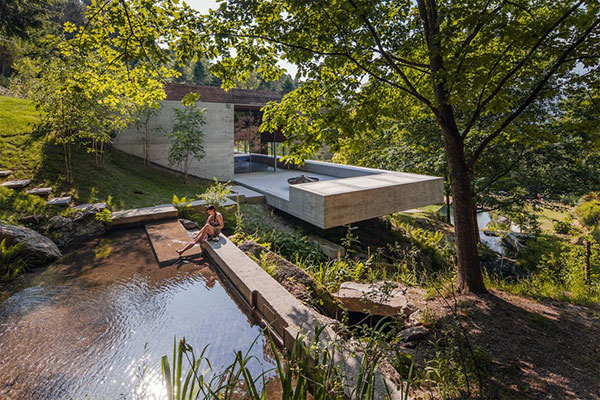 Carvalho Araujo工作室设计了位于布拉加的Geres住宅。项目坐落于葡萄牙唯一的国家公园内的一个陡坡上。此前场地上的住宅由于山体滑坡危险遭到拆除。新建筑利用山地背景,可从二层进入室内。住户拥有面向如画风景的视野,面前展开的是潺潺溪水和汇聚而成的湖泊。