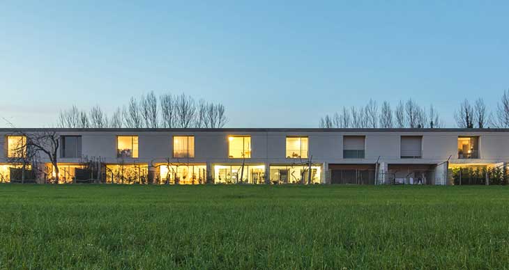 Murmuro的小憩住宅位于葡萄牙北部布拉加城郊,周边正在经历从农村到城郊的开发。起初,开发商计划建立9栋大尺寸的独立住宅。不过,2008年房产危机产生了对于成功开发的疑虑,随后年轻的建筑师受命重新构想方案,完成了全然不同的策略。新方案包含12栋相对较小的住宅,价格亲民,更容易被年轻业主接受。这一理念反应在设计变化中,设计师将停车场改在地下,并在地下设置了停车场入口,将所有车库连接起来。场地另一边设有入口坡道,垂直核心结构满足安全规范,解决了紧急出口和整体出入需求。