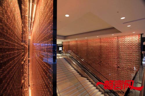 这两座玻璃墙长12米、高8米,它们会在一天中不断变换颜色,连同位于前台后面的玻璃艺术品一起,来不断变换这里的格调和氛围 --- 无论你一天中几次经过这里,它时刻都会给你一种新奇的感觉。从宾客踏进这里开始,这里整体的格调就不断变换着,并且一次次的为宾客创造出不同的视觉体验。