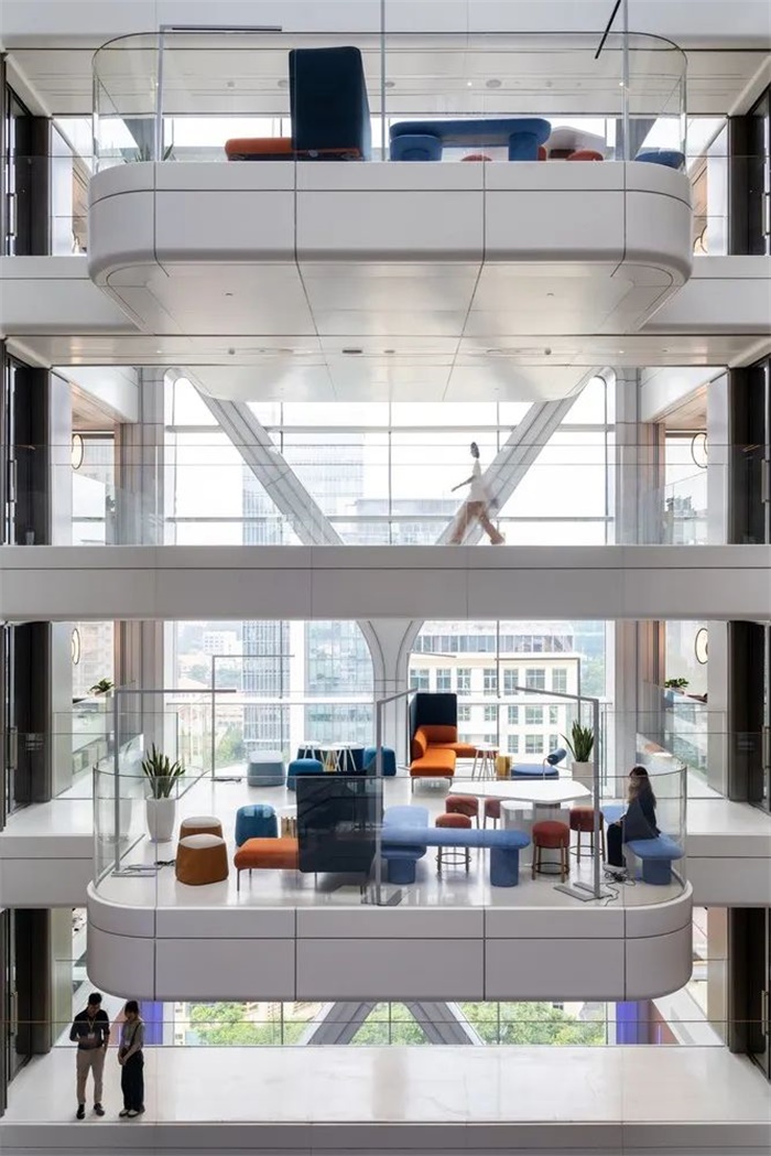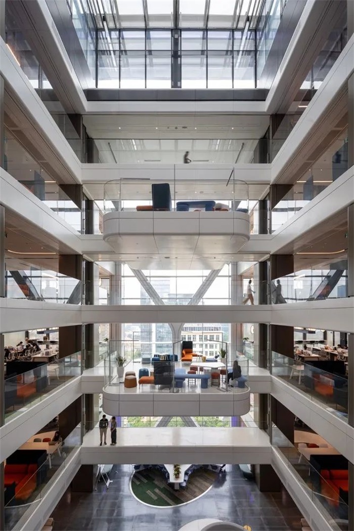 设计营造了一个光线充足、温馨的环境,有三个高度各异的中央中庭。第一个中庭从底层一直延伸到 9 层,第二个和第三个中庭从 11 层和 14 层一直延伸到塔楼的整个高度。这些空旷的空间提供了视觉连接,并包含会议空间“吊舱”,共同营造出一种协作和包容的工作场所文化。