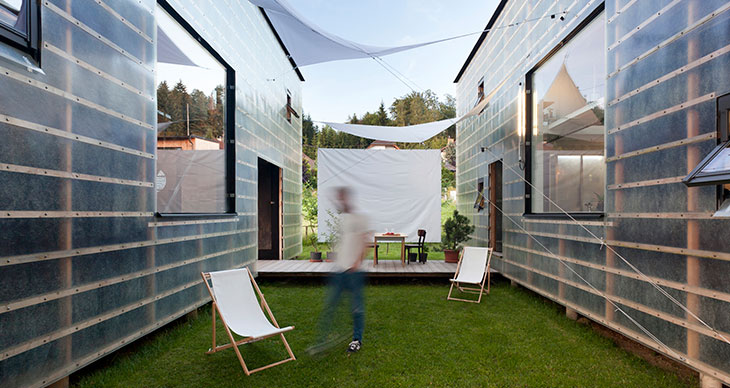 项目位于捷克Liberec,分成住宅和工作室两部分,结合居住和工作两大功能。设计采用直截了当、高效的施工技术,基于住宅开发的简洁理念。项目由Petr Stolin事务所设计,由两个完全相同的立方体组成。这两个立方体都是3米见方,分别有两层,坐北朝南,并排而设。外部围合是覆盖在简单木质框架基础上的亚克力板,凸显了裸露木质框架的细部设计。