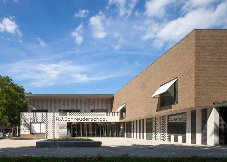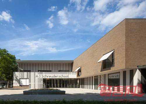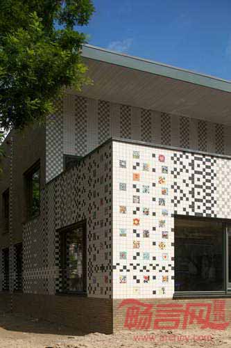 荷兰Korteknie Stuhlmacher建筑事务所设计了鹿特丹的一所学校,建筑外立面由若干黑白瓷砖组成,其图案来自传统荷兰室内装饰。A.J. Schreuder学校是一座面向学习障碍症儿童的学校,其略显俏皮的外立面给人亲切熟悉的感觉。设计师透露,“外墙采用经典荷兰住宅装饰图案,常用语住宅的入口和厨房。我们认为这些图案不仅起到装饰作用,同时使得户外空间具有室内般的氛围。”设计师邀请学校中的儿童亲自设计入口处的瓷砖装饰图案。