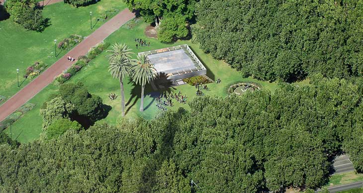MPavilion设在澳大利亚墨尔本,是一个举办展览和实验活动的空间。每年场馆使用时间为四个月。第四座场馆在2017年秋季对外开放,由荷兰OMA事务所完成,这也成为这家著名事务所在澳洲的首个项目。场馆坐落在市中心Queen Victoria花园中。OMA设计的临时结构不仅为各类活动提供了充足空间,其自身也是一个展品。新建建筑受到了半圆剧场的灵感启发。两个舞台,分别是静态和可移动状态,构成了演出空间的背景。