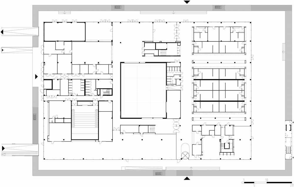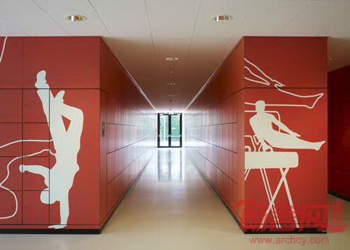 同时,可以将教学区域完全封闭起来,从而使体育馆成为唯一能够进入的区域,这方便体育赛事或其他体育活动期间的管理。自行车手、体操选手和其他运动员的图形装饰了建筑的三个立面,而室内颜色鲜艳的墙面上出现了更多运动员的英姿。部分器械和设施上装饰了运动口号。