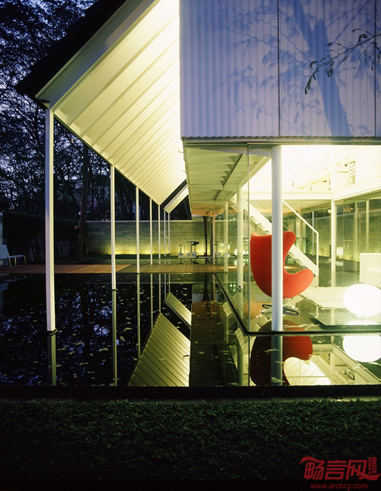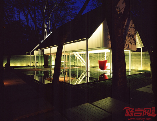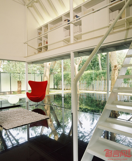 宽大的倒影池与建筑的两侧紧密相接,一个木质平台横跨整个场地,将其分为两部分。一楼是一个双层高的工作区域,穿过平台,有一个小会议室。一楼的外墙采用玻璃制成,在池水倒映下,显得室内空间增大了一倍,整个仿佛工作室“漂浮”在水面上一样。