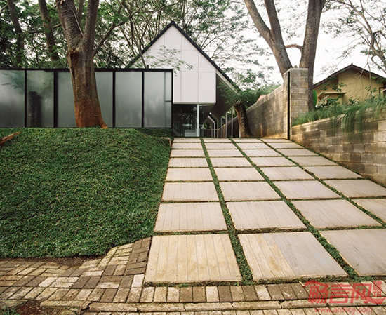 在印度尼西亚首都雅加达以西12英里处的一座郊外卫星城里,有一间“漂浮”的工作室,周围是方正的围墙,院内有许多原本就生长在这里的树木。这是一间供10位建筑师使用的工作室。