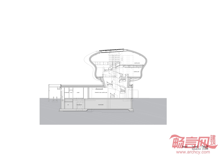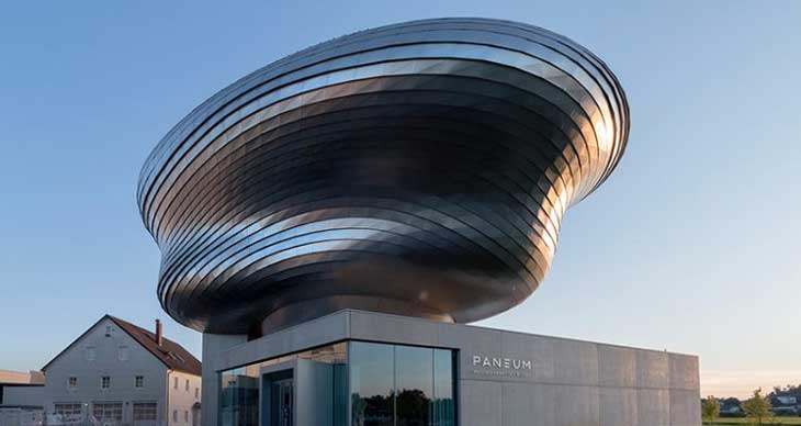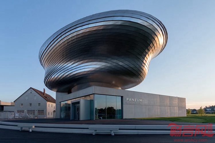 Coop Himmelblau在奥地利北部完成了一家面包企业建筑。项目包含两个组成部分,分别是可用于各类活动、演讲或研习会的盒子状基座,容量为120人;以及Wunderkammer Des Brotes,一座凌驾于基座上方的两层排练空间。两个部分用充满反差的材料建造,现浇汇凝土用于底座,木质博物馆外立面覆层则是不锈钢材质。