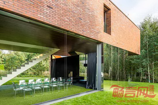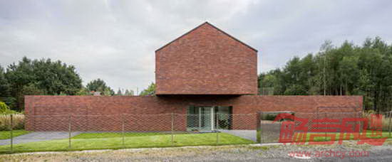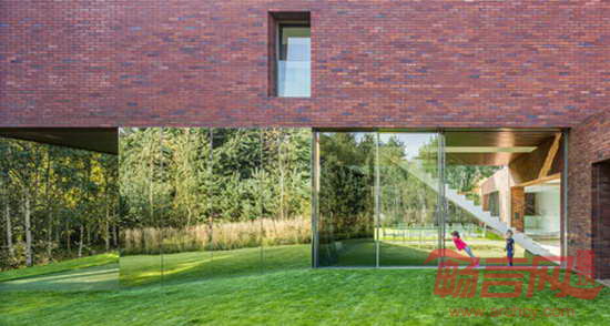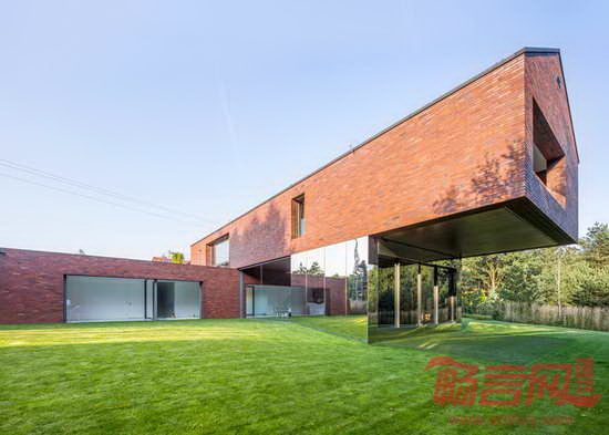 项目位于波兰南部Katowice,由建筑师Robert Konieczny设计。两层建筑具有一切郊区住宅特点,分别是坡屋面、红砖墙和宽敞的车库。然而,建筑最醒目的特点是二层进行了90度的扭转,因此盘踞在一层纸上,朝向花园。混凝土砖墙支撑起悬挑结构,一层覆盖了镜面不锈钢,反射美丽的花园景象。